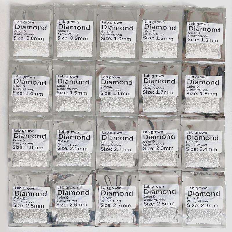 เพชรหลวมเพาะเลี้ยงในห้องปฏิบัติการ น้ำหนักรวม 16.40 กะรัต ขนาด 0.80 ถึง 4.50 มม. รูปทรงกลม เจียระไนแบบ EX-VG ความสะอาดระดับ VVS-VS สี D-E สำหรับทำเครื่องประดับ แหวน