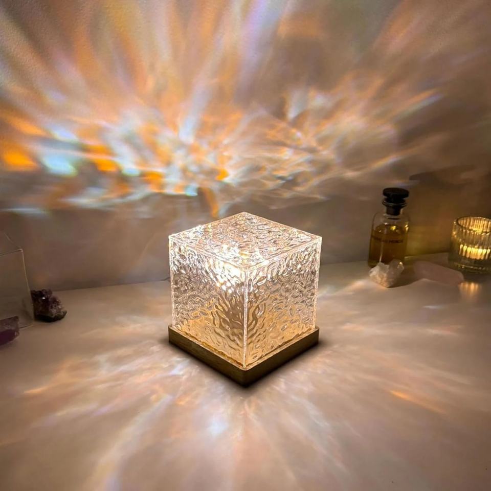 โคมไฟคริสตัลออโรร่า LED หมุนได้ 16 สี พร้อมเอฟเฟกต์ลวดลายคลื่นน้ำสีฟ้าแบบไดนามิก รูปทรงลูกบาศก์ ฉายแสงเหนือ ใช้เป็นโคมไฟตั้งโต๊ะหรือไฟกลางคืน