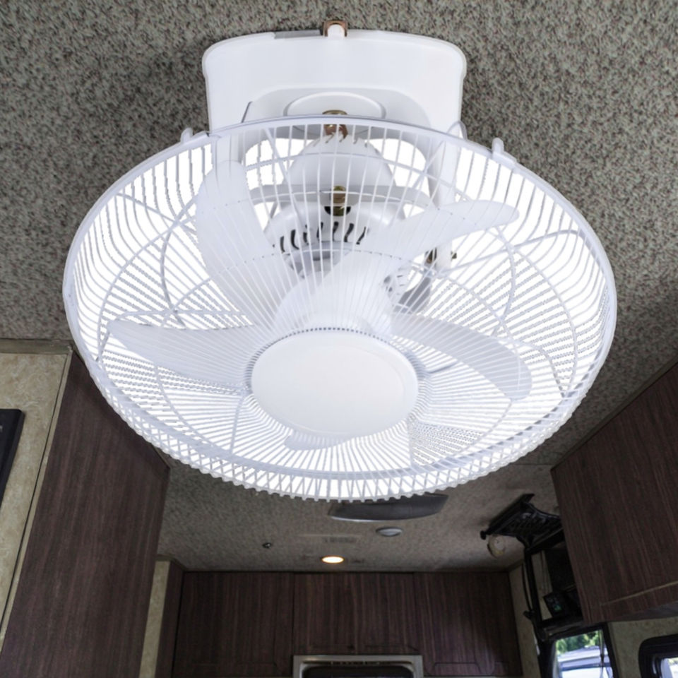 พัดลมติดหลังคาขนาด 16 นิ้ว ใช้มอเตอร์ไฟฟ้ากระแสตรง สำหรับใช้งานกลางแจ้ง รถยนต์ รถบ้าน รถบรรทุก ใช้ในครัวเรือน ชาร์จได้ โครงโลหะสีขาว ใบพัดพลาสติก 5 ใบ ใช้พลังงานแสงอาทิตย์/ไฟฟ้า