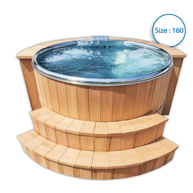 อ่างน้ำร้อนกลางแจ้งทรงกลมขนาด 160 ซม. พร้อมฝาปิดไม้ซีดาร์แดงสแตนเลส 304 บันได 1 ขั้น สำหรับวิลล่า โรงแรม โซนสุขภาพ