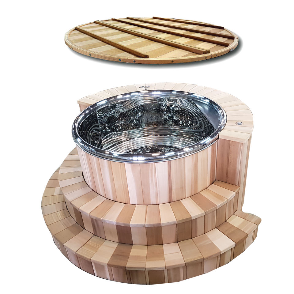อ่างน้ำร้อนกลางแจ้งทรงกลมขนาด 160 ซม. พร้อมฝาปิดไม้ซีดาร์แดงและสแตนเลส 304 พร้อมบันได 2 ขั้น สำหรับวิลล่าและโรงแรม