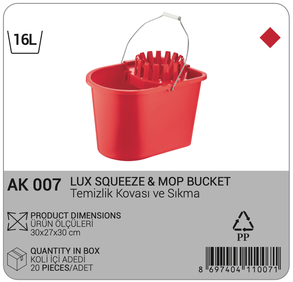 ถังถูพื้นพลาสติก PP ขนาด 16 ลิตร เป็นมิตรกับสิ่งแวดล้อม พร้อมที่บีบน้ำ ทนทาน พกพาสะดวก น้ำหนักเบา เหมาะสำหรับใช้ในบ้าน ร้านค้า ภายใน/ภายนอกอาคาร