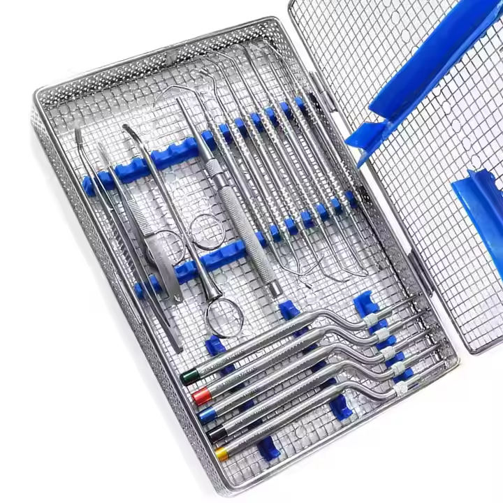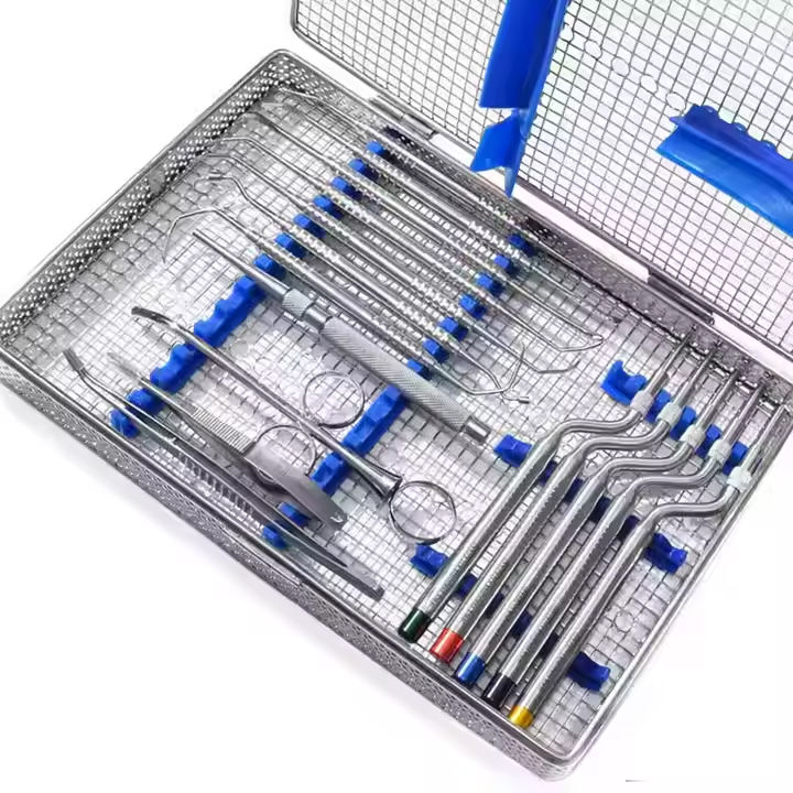 ชุดเครื่องมือผ่าตัดกระดูกสำหรับปลูกถ่ายฟัน 16 ชิ้น ทำจากสแตนเลสสตีล ประกอบด้วยอุปกรณ์ยกไซนัส โอสเตโอโทม คีร์เร็ตแบบเห็ด และลูคัส คิวเร็ต ใช้งานด้วยมือ