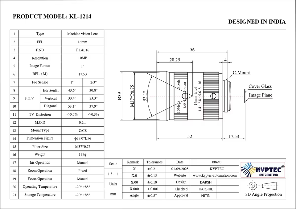 เลนส์วิชันซิสเต็มขนาด 16 มม. ความละเอียดสูง 10MP ขนาด 1 นิ้ว สำหรับระบบอัตโนมัติในอุตสาหกรรมและการตรวจสอบ