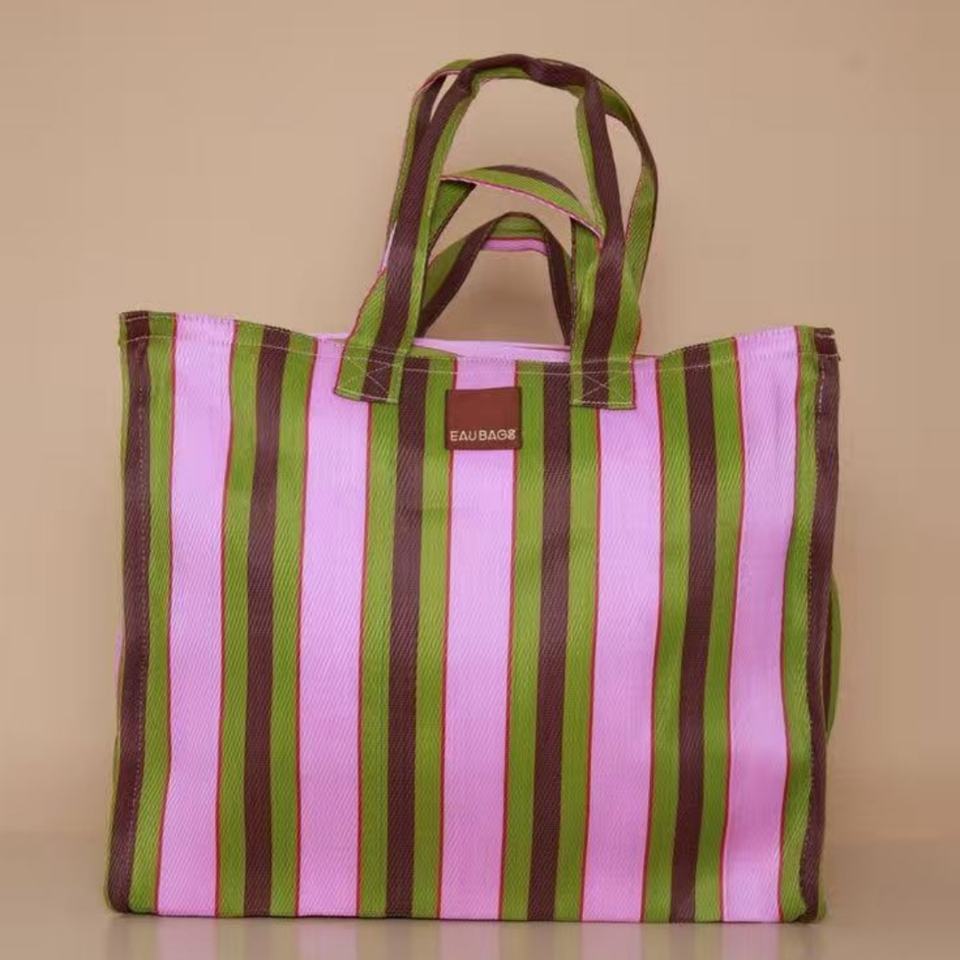 กระเป๋าผ้าแคนวาสลายทาง ขนาด 17 นิ้ว น้ำหนัก 14 ออนซ์ ความจุเยอะ พร้อมโลโก้พิมพ์