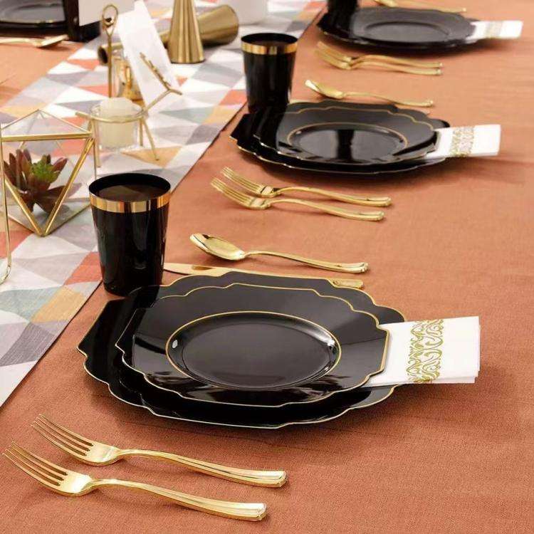 ชุดจานพลาสติกสีดำและสีทอง175ชิ้นประกอบด้วยจานอาหารค่ำและของหวานชุดช้อนส้อมผ้าเช็ดปากงานแต่งงาน