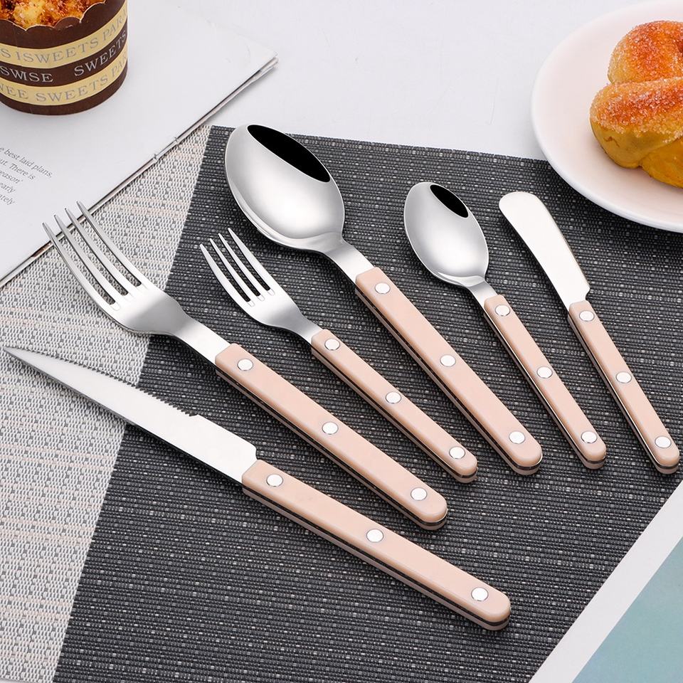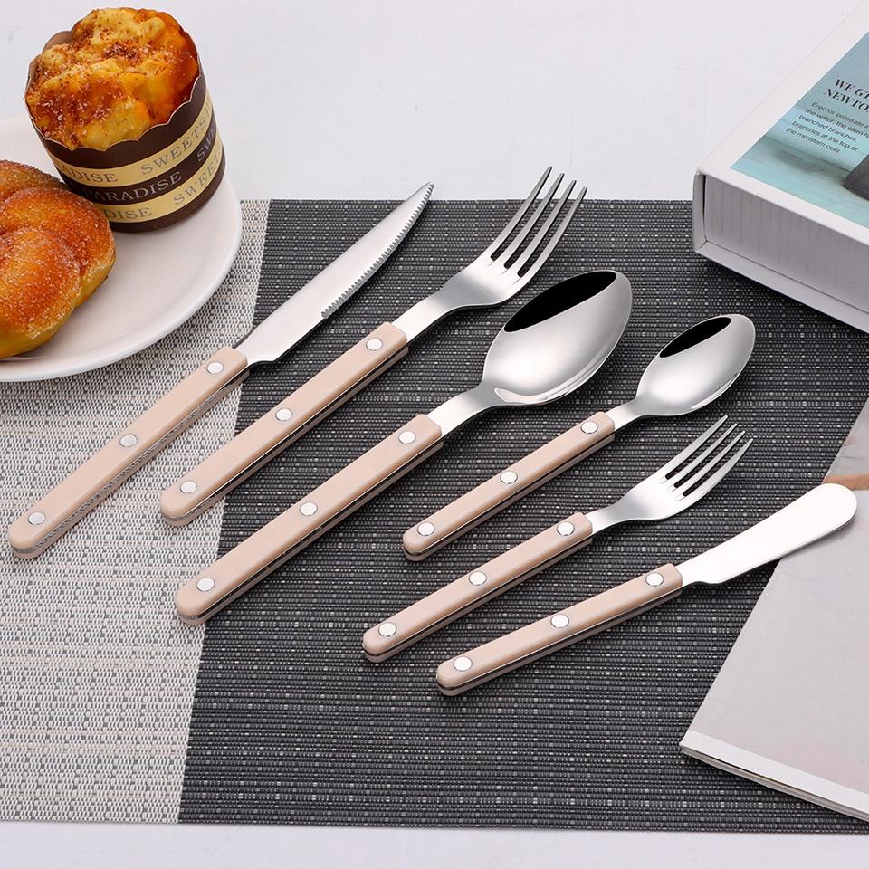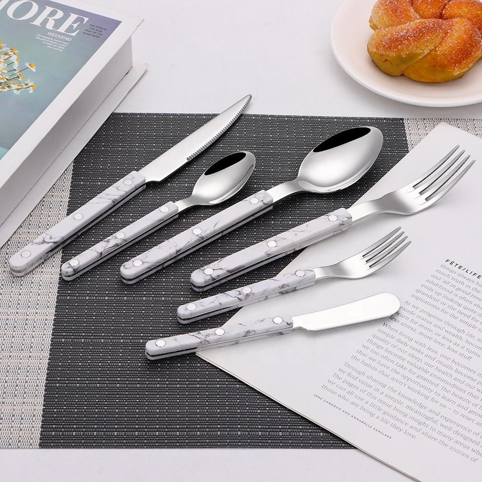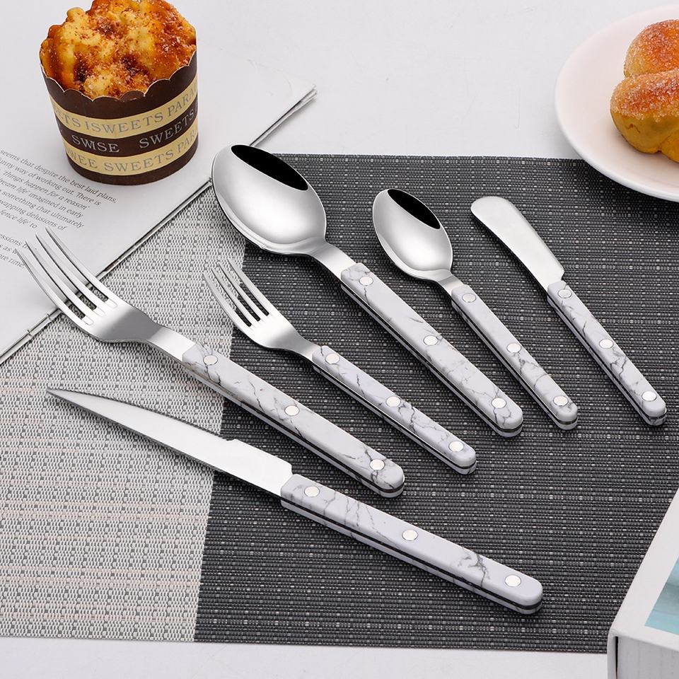 ชุดเครื่องใช้บนโต๊ะอาหารกระจกสแตนเลส18-10พร้อมหินอ่อน ABS ด้ามมีดส้อมช้อนส้อมมีดด้ามพลาสติกงาช้างน้ำหนักเบา