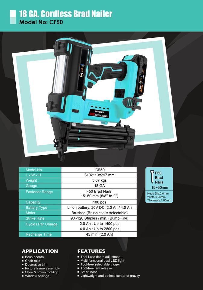 18 Ga. เครื่องตอกตะปูไร้สาย CF50อุตสาหกรรมและแบบทำมือสามารถใช้ตะปูได้ถึง1300ตัว/ชาร์จตกแต่ง
