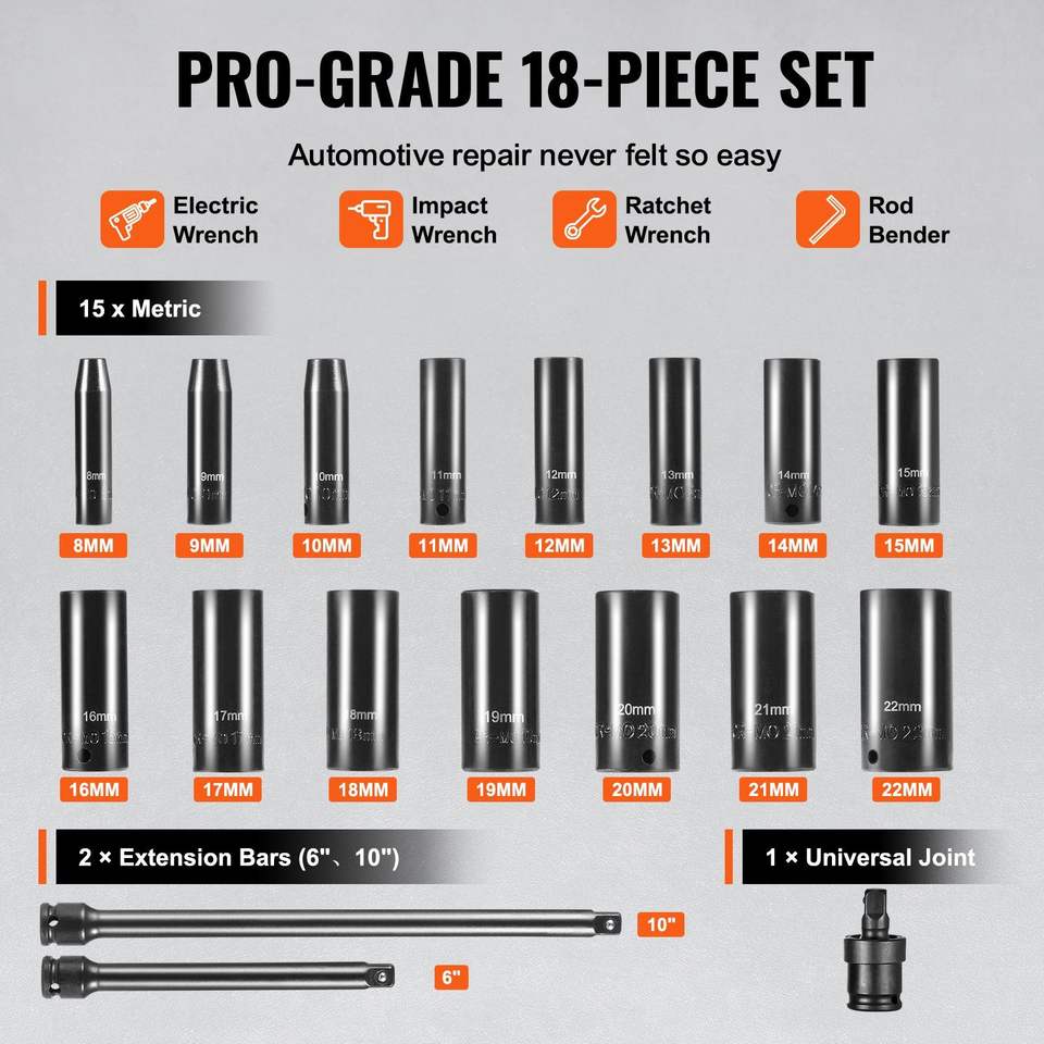 ชุดบล็อกหกเหลี่ยมแบบยาว 18 ชิ้น ขนาด 3/8 นิ้ว 8-22 มม. 6 จุด วัสดุ CR-V อัลลอยด์สตีล พร้อมข้อต่อ ใช้งานง่าย อ่านค่าได้ชัดเจน เหมาะสำหรับซ่อมรถยนต์