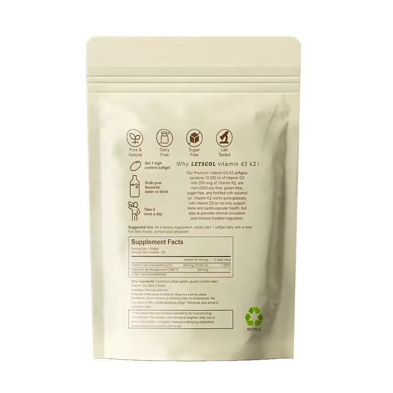 180วันวิตามิน D3มังสวิรัติ + ซอฟต์เจล K2แหล่งของพืช10000iu วิตามิน D3 200mcg แคปซูลซอฟต์เจล K2-Mk7เพื่อสุขภาพของภูมิคุ้มกันและหัวใจ