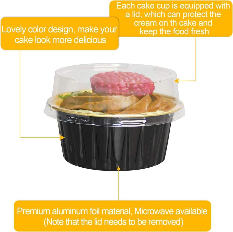 ถาดอบเค้กขนาดเล็กสีดำ 180 มล. 6 ออนซ์ แบบใช้แล้วทิ้ง สำหรับเบเกอรี่ ถาดคัพเค้กสี่เหลี่ยมขนาดเล็ก แม่พิมพ์ขนมหวาน ภาชนะอลูมิเนียมฟอยล์พร้อมฝาปิด