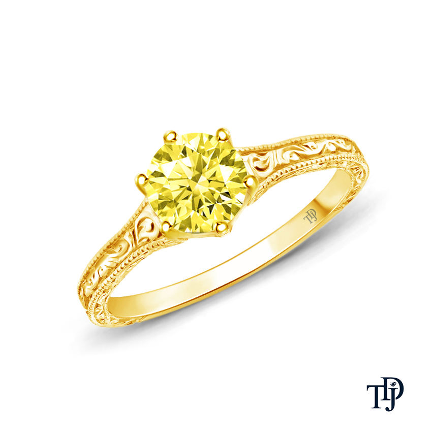 แหวนหมั้นทองคำ 18K สีเหลืองโบราณ ประดับพลอยไพลิน พร้อมลายสลักมือแบบมิลเกรนสุดหรู