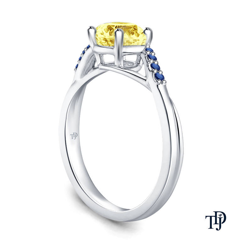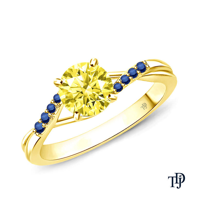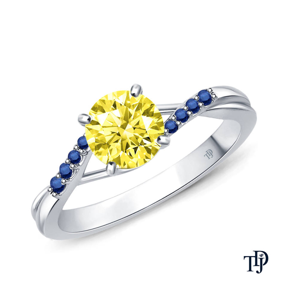 แหวนหมั้นทองคำ 18K ประดับพลอยไพลินสีน้ำเงินทรงเรียวละเอียดอ่อนและพลอยไพลินสีเหลืองตรงกลาง