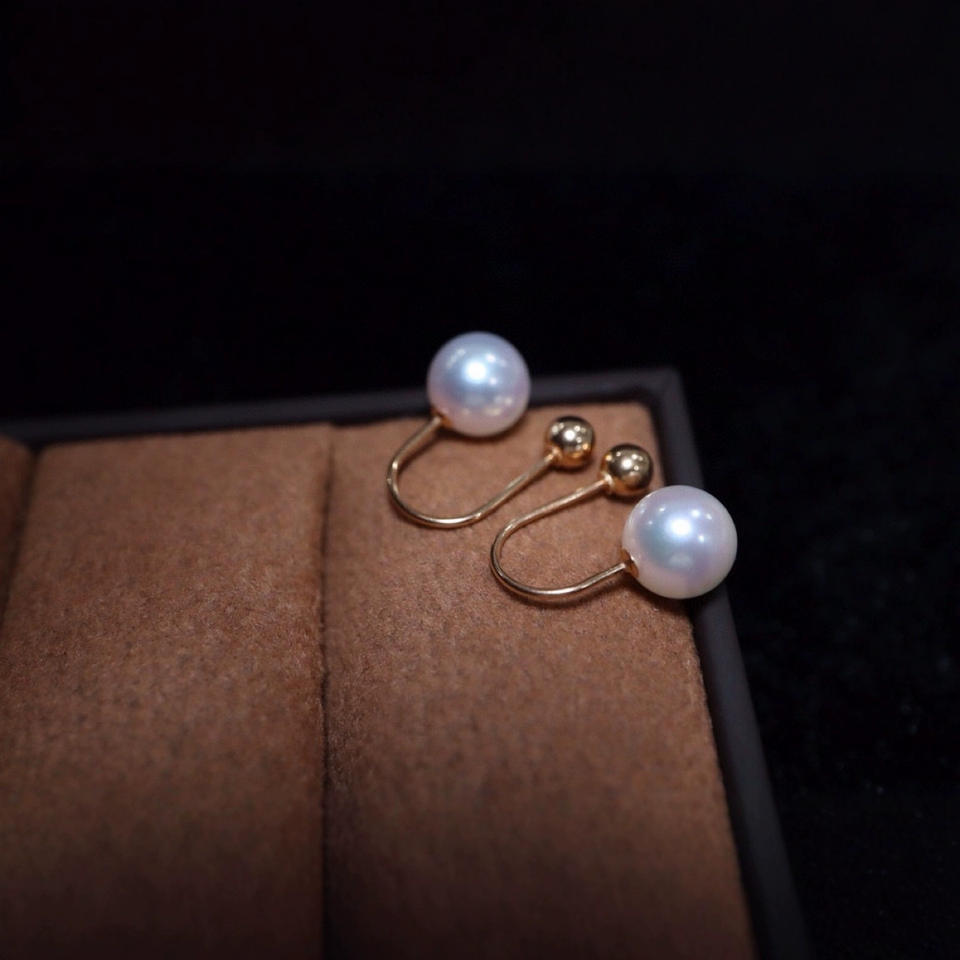 ต่างหูมุกอะโกย่าน้ำจืดทอง 18K ขนาด 8-8.5 มม. ลูกปัดสวยเกือบไร้ตำหนิ ทันสมัย มีสไตล์ แสงสว่างสวยงาม สามารถดึงได้