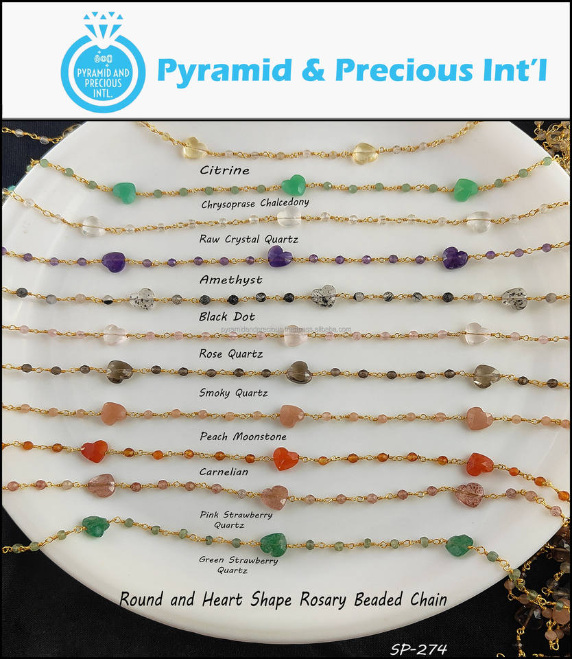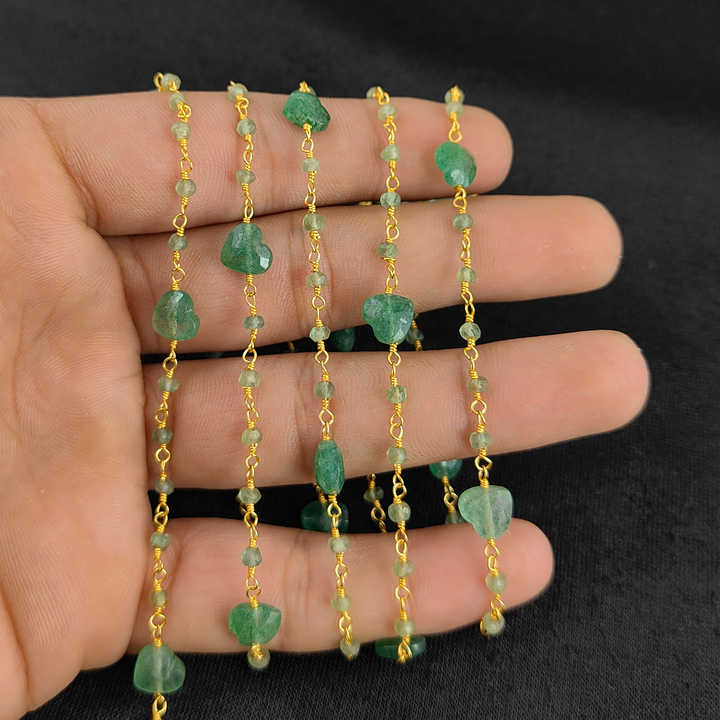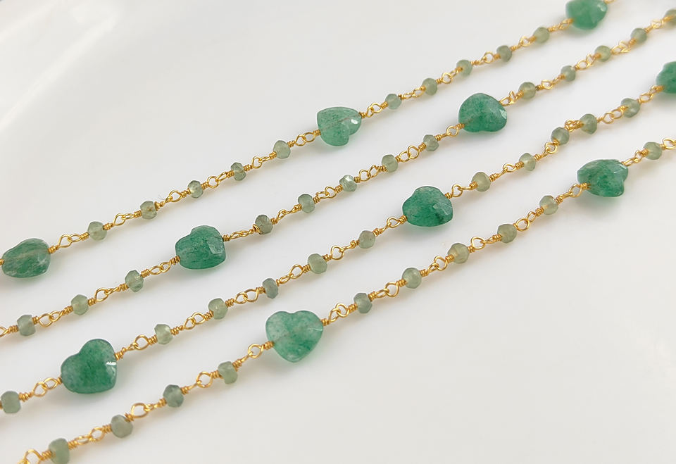สร้อยลูกประคำประดับพลอยสตรอเบอรี่สีเขียวทอง18K ประดับลูกปัดทองเหลืองรูปหัวใจ