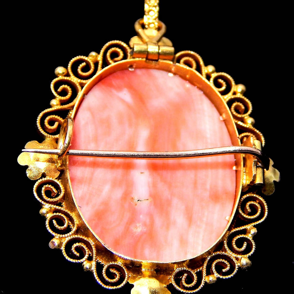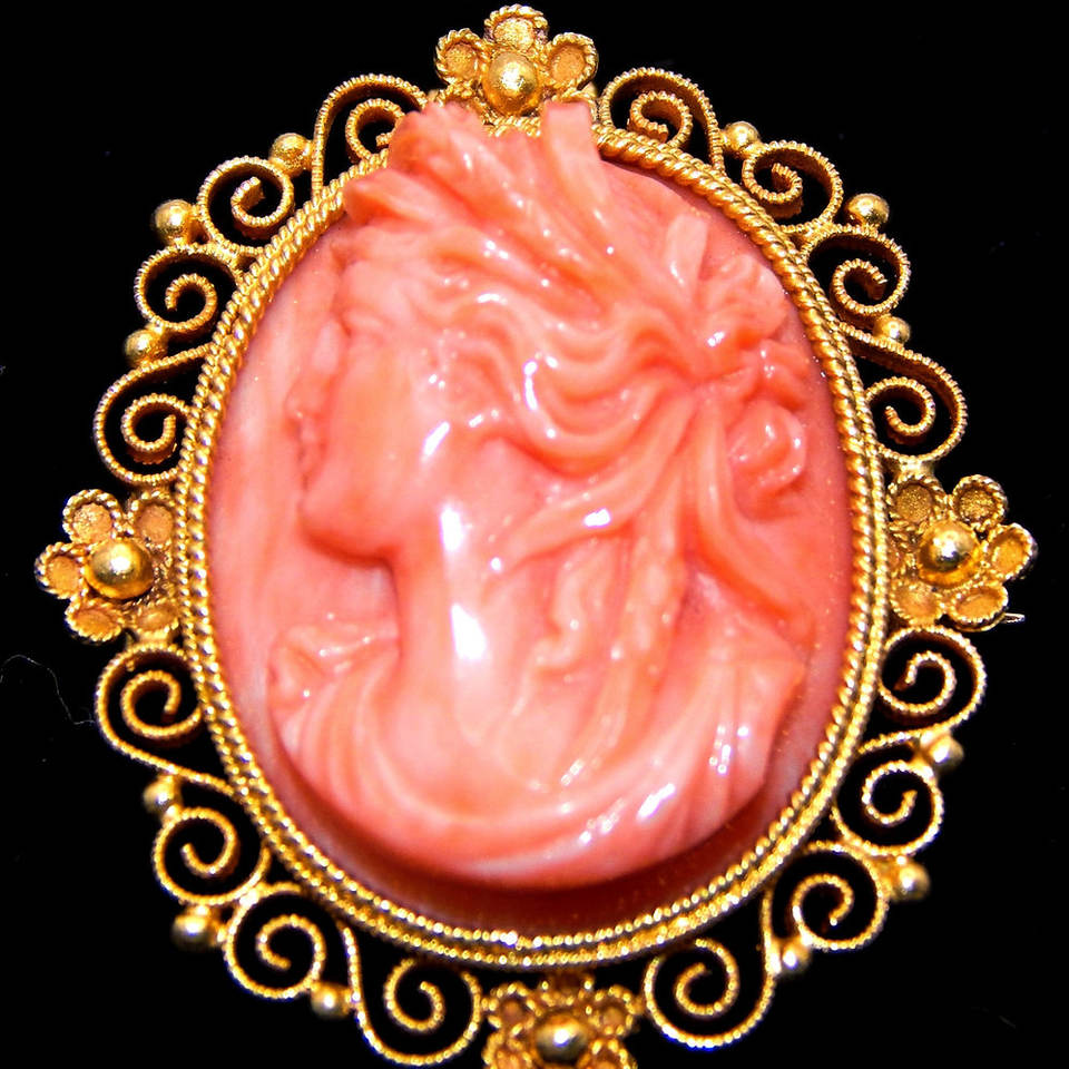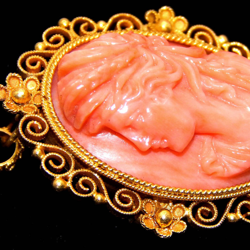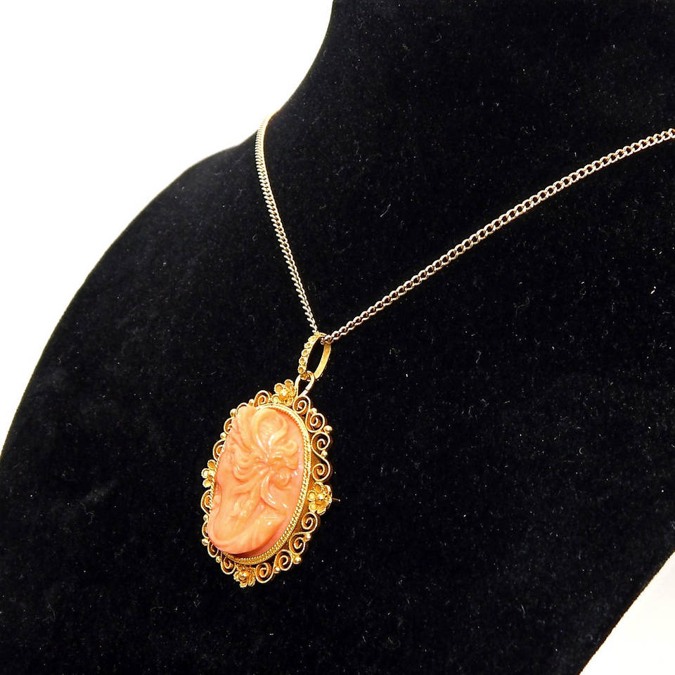18K Gold Pink Coral Cameo Pin/Pendant with 14K Gold Curb Chain Vintage Style Diamond & Crystal Charm Pendants Water Drop Pattern