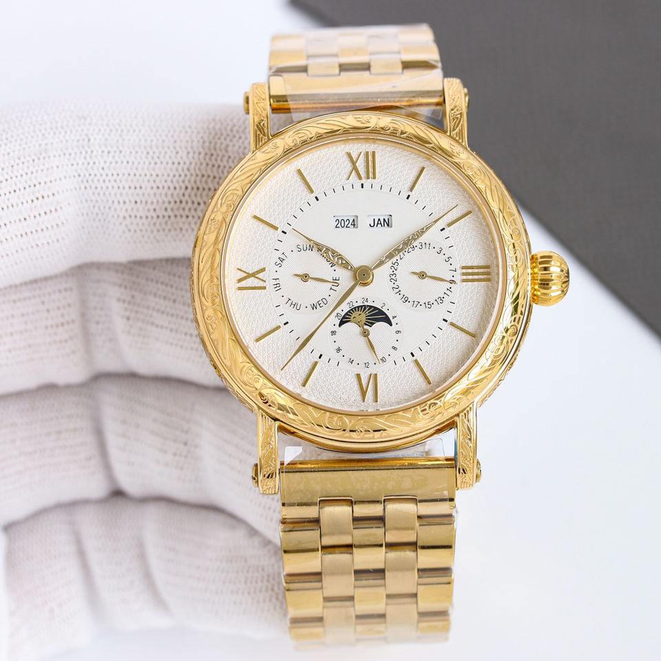 นาฬิกาเคลือบทอง 18K พร้อมหน้าปัดแสดงข้างขึ้นข้างแรมแบบเต็มรูปแบบ ตัวเรือนสลักลายทอง ขอบหน้าปัดลายแกะสลัก ดีไซน์หรูหราโดดเด่น