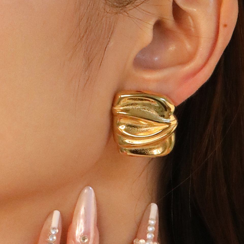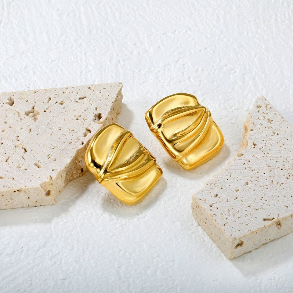 ต่างหูสแตนเลสสตีลทรงสี่เหลี่ยมผืนผ้าลายขัดเงาเคลือบทอง 18K ดีไซน์ลายเส้นแฟชั่น