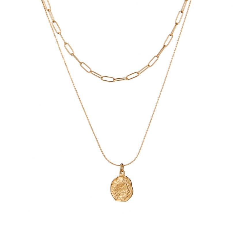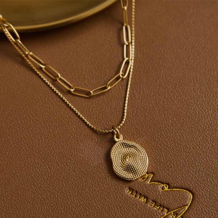 สร้อยคอสองชั้นสไตล์เรโทรชุบทอง 18K ลายลาวาเว้าแบบเรียบง่าย พร้อมจี้รูปทรงเรขาคณิต วัสดุสแตนเลส