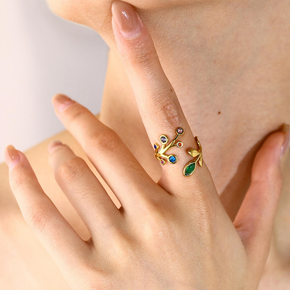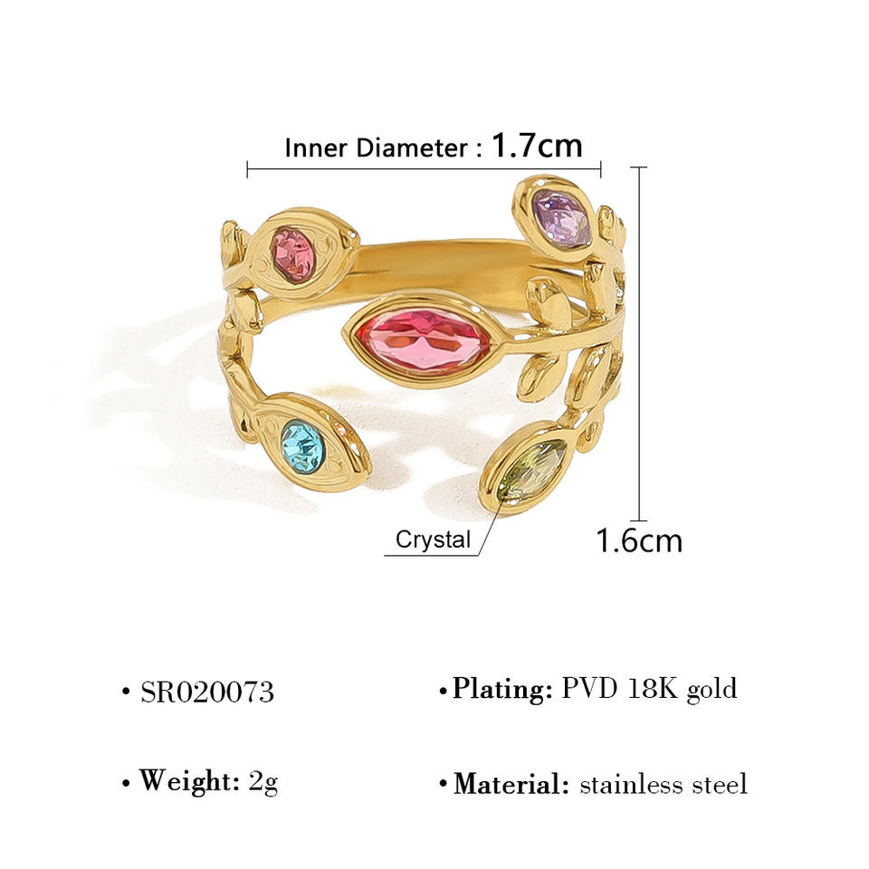 แหวนสแตนเลสสตีลชุบทอง 18K ปรับขนาดได้ ดีไซน์ใบไม้ประดับเพชรรุ้งใหม่ สำหรับงานแต่งงาน งานหมั้น งานเลี้ยงฉลองครบรอบ