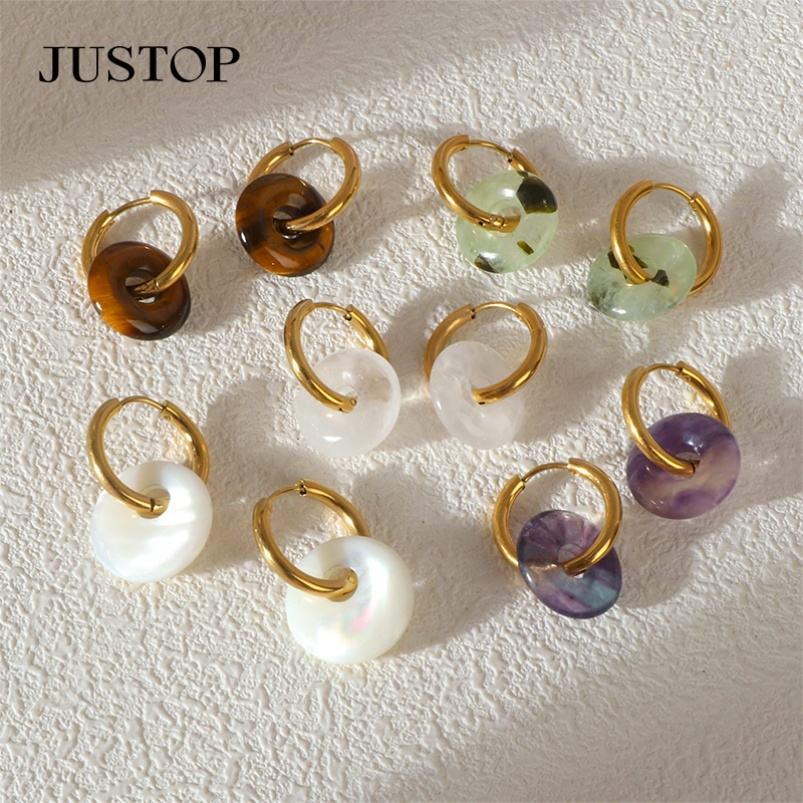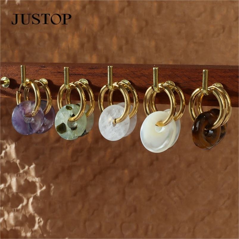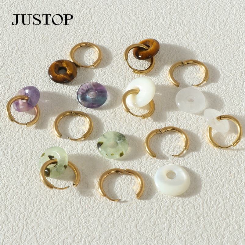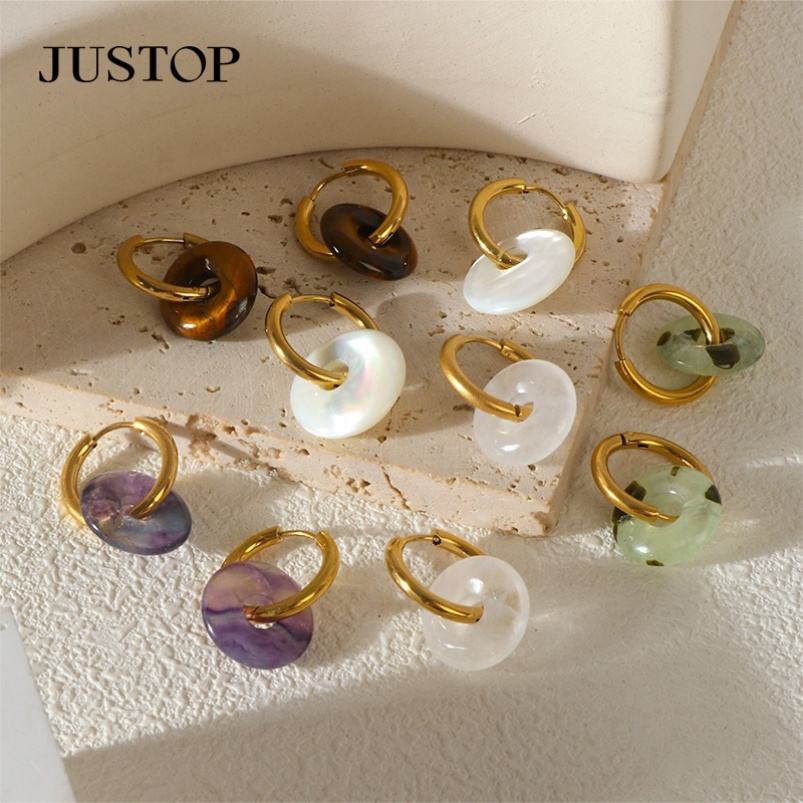 ต่างหูห่วงสแตนเลสชุบทอง18K ต่างหูมุกสีชมพูหยกเครื่องประดับสำหรับใส่ได้ทั้งชายและหญิง