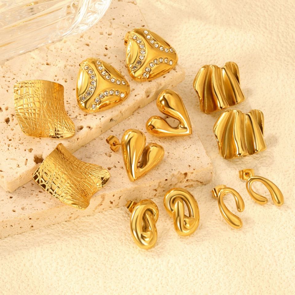 เครื่องประดับสแตนเลสชุบทอง 18K ต่างหูแบบติดหูทรงเรขาคณิต ดีไซน์โค้งมนประดับเพชรซิร์คอนรูปหัวใจ สำหรับงานแต่งงาน