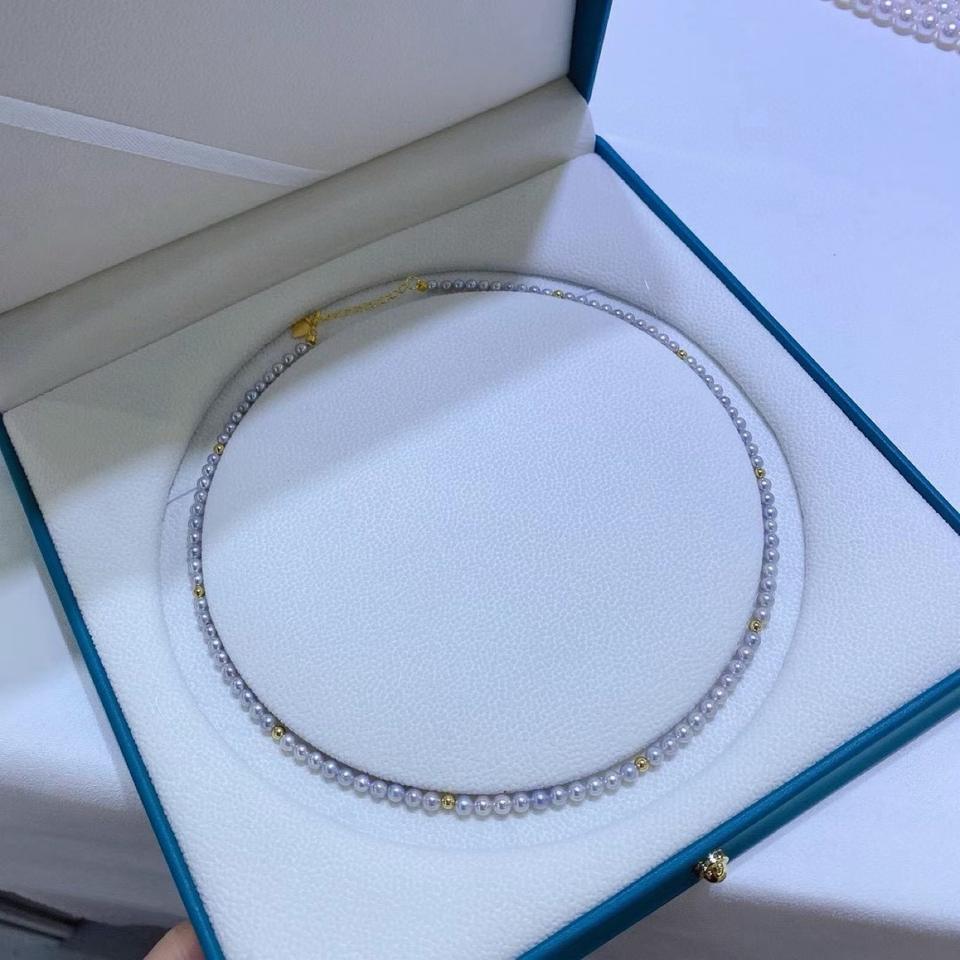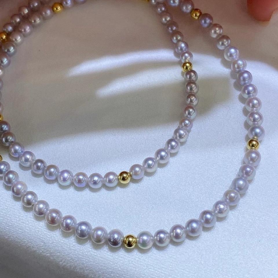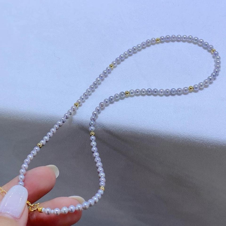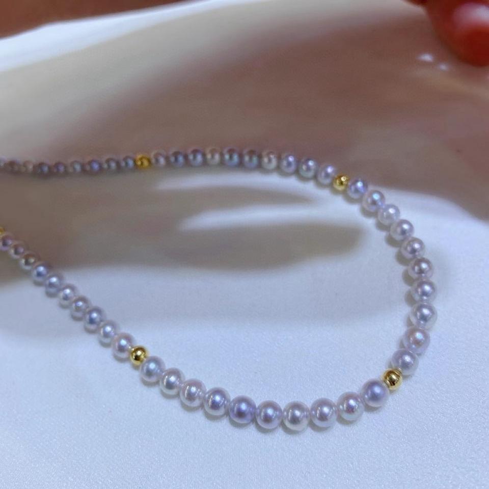สร้อยคอไข่มุกธรรมชาติจากป่านแท้ ประดับด้วยลูกปัดทองคำ 18K ขนาดเล็ก 5-4 มม. ทรงกลม ไร้ตำหนิ และลูกปัดเหล็กขนาดเล็ก