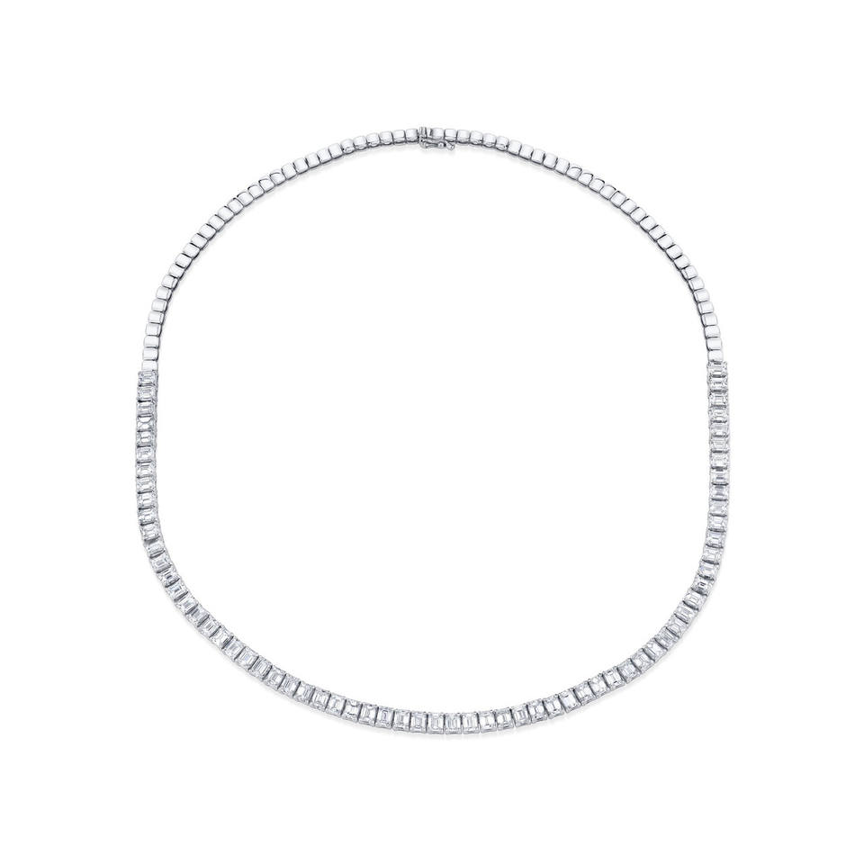 สร้อยคอเทนนิสทอง 18K ประดับเพชรทรงมรกต ตัวเรือนโลหะแบบ Bezel พร้อมขาตั้งแบบ Prong Set ผลิตโดย OEM ขายส่ง ขายปลีก ผู้ผลิตเครื่องประดับระดับนานาชาติ