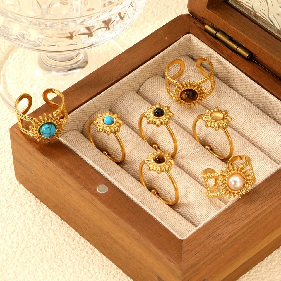 แหวนแต่งงานเรียบง่ายสแตนเลสสตีลชุบทอง 18K PVD กันน้ำ ประดับด้วยเทอร์ควอยซ์รูปพระอาทิตย์ แหวนปรับขนาดได้สำหรับผู้หญิง