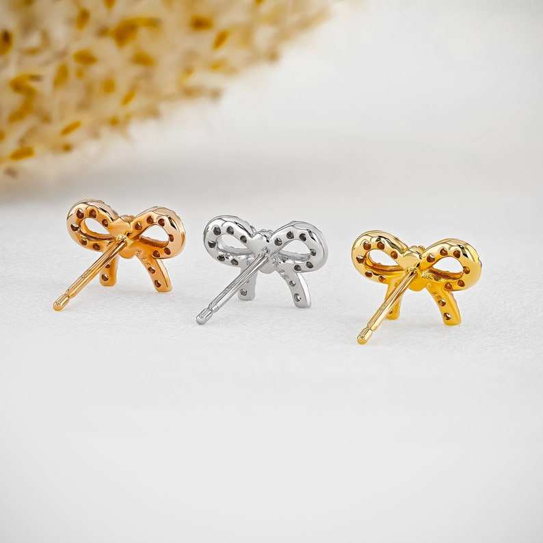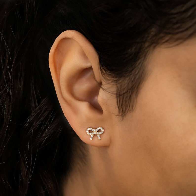 18K ต่างหูเม็ดกลมเพชรแท้แบบเดี่ยว (ครึ่งคู่) สำหรับเธอในการออกแบบโบว์กระดุมที่ไม่ซ้ำกัน