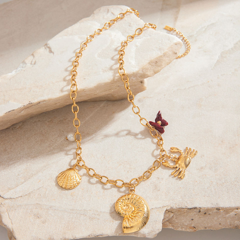 18K Real Gold Plated Stainless Steel Waterproof Charm Necklace Ocean Shell Pearl Crab with Trendy Link Chain