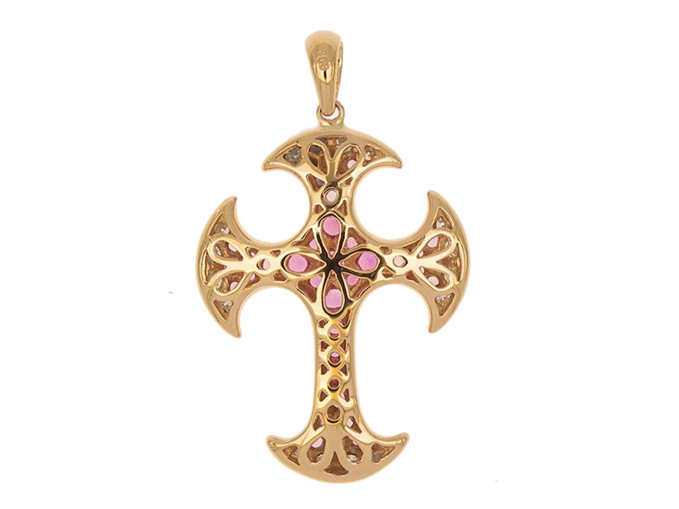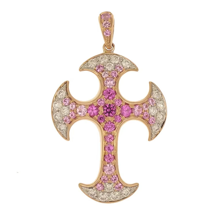 จี้รูปไม้กางเขนมอลทีสทองคำชมพู 18K ประดับด้วยพลอยแซฟไฟร์สีชมพูไล่เฉดและเพชรฝังแบบพาเว่ เครื่องประดับสุดหรูหราโรแมนติก