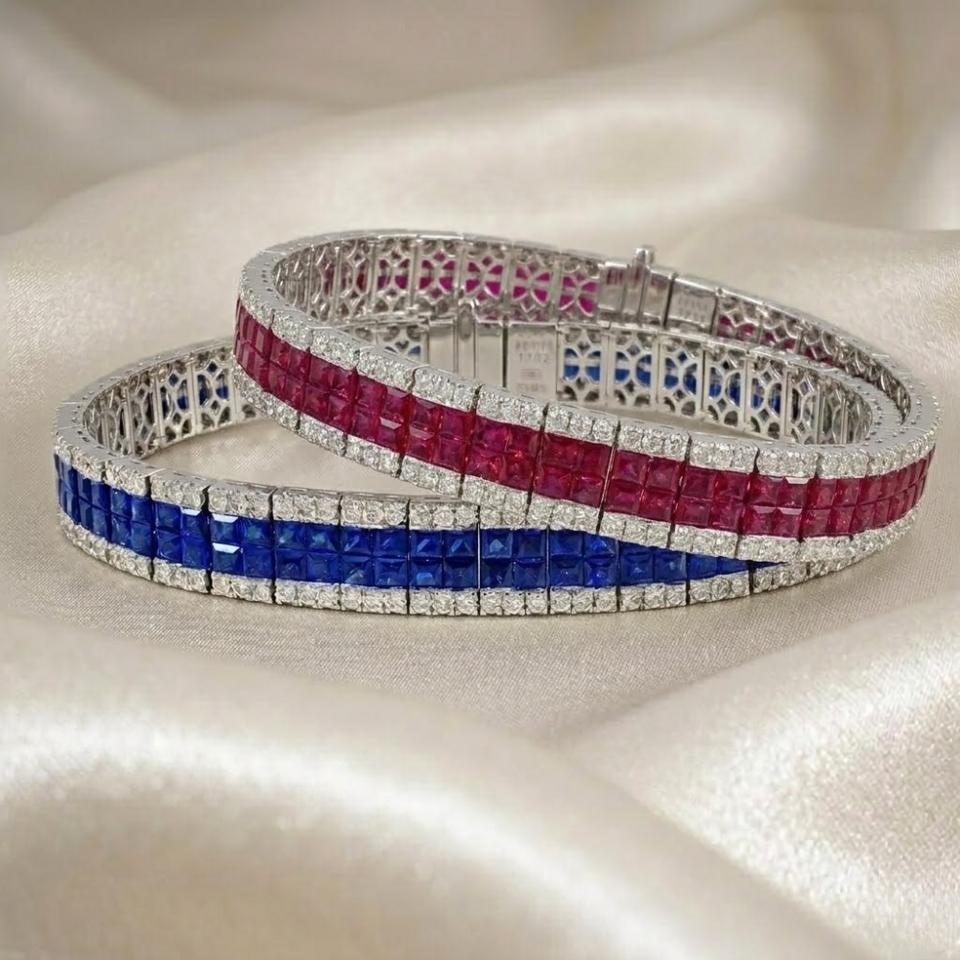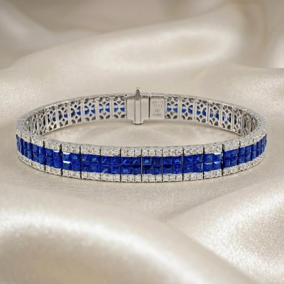 งานฝีมือคุณภาพสูง ดีไซน์ทองคำแท้ 18K ประดับเพชรธรรมชาติและไพลินสีน้ำเงินรอยัลบลูทรงปรินเซสคัท สร้อยข้อมือนุ่มนวลสำหรับงานปาร์ตี้