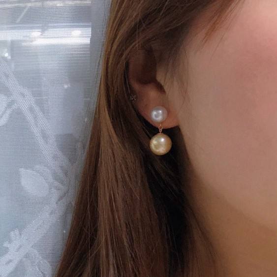 ต่างหูทองหนา 18K ประดับมุกออสเตรเลียสีขาว 10-11 มม. รูปทรงน้ำทะเล แสงสว่างแรง ใกล้เคียงกับมุกไร้ตำหนิ