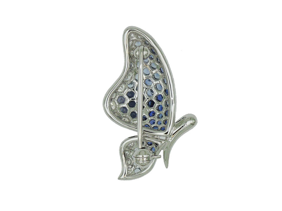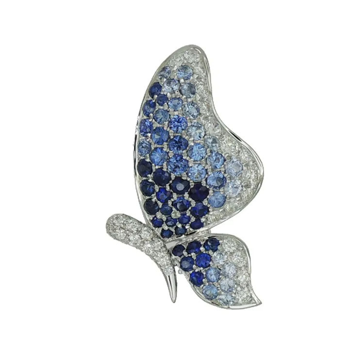 เข็มกลัดรูปผีเสื้อแบบอสมมาตรทองคำขาว 18K ประดับด้วยไพลินสีน้ำเงินไล่เฉดและเพชรแบบฝังฝังอย่างสวยงาม ดูดีเหมือนงานศิลปะ