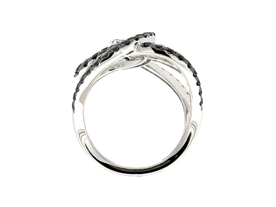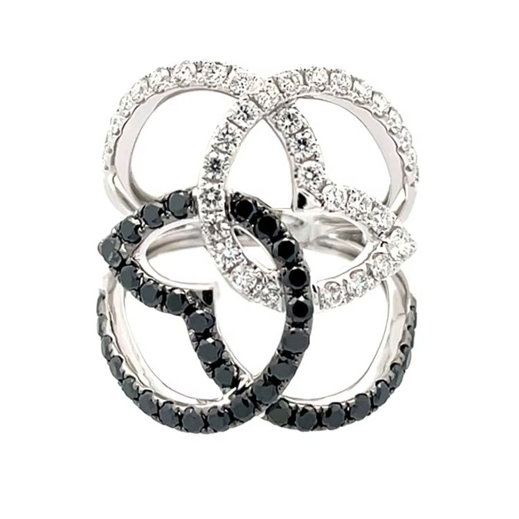 แหวนทองคำขาว 18K ประดับเพชรดำและขาว ดีไซน์หลายวงแหวนสานเข้าด้วยกัน แหวนดีไซน์โดดเด่นหรูหราสำหรับผู้หญิง