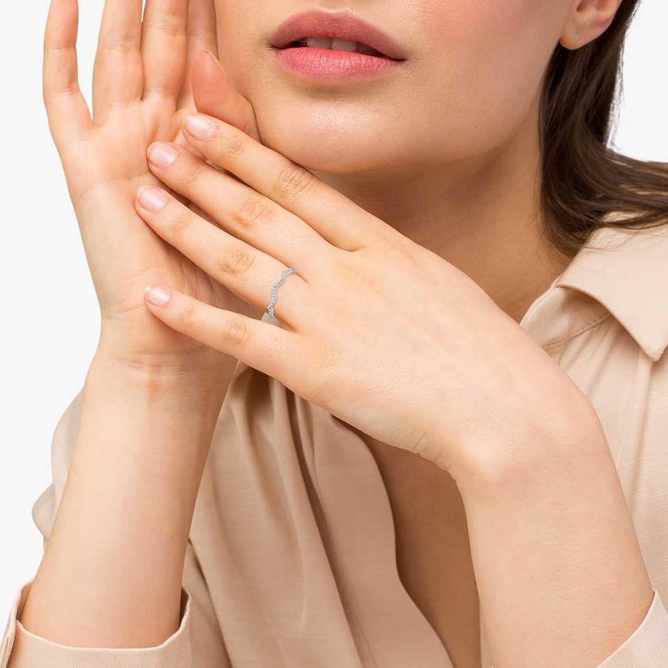 แหวนแต่งงานประดับเพชรทรงโค้งมนทองคำขาว 18K 0.13 กะรัต ชุดเครื่องประดับชั้นดี