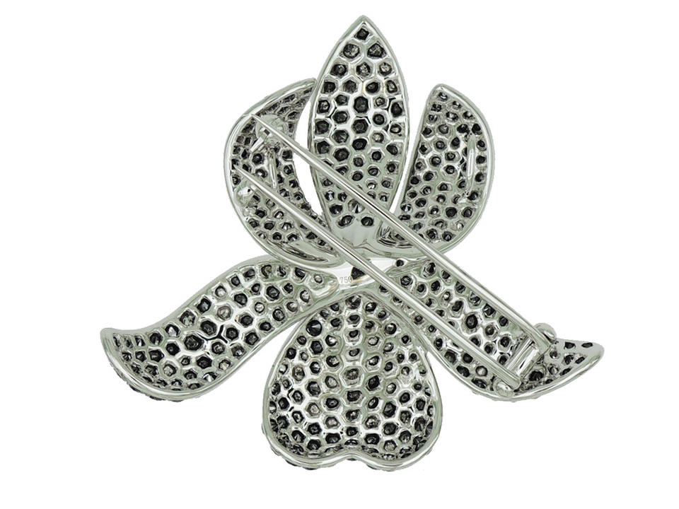 เข็มกลัดรูปดอกไม้สุดหรูหราดีไซน์ทันสมัยจากทองคำขาว 18K ประดับเพชรดำแบบ Pave และเพชรขาวตรงกลาง เครื่องประดับสุดโรแมนติก