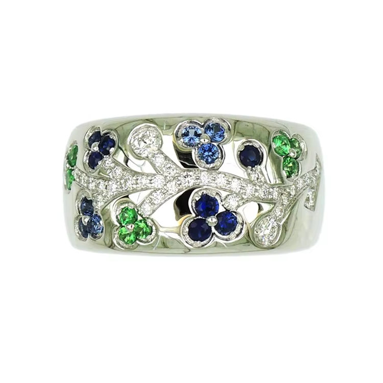 แหวนทองคำขาว 18K ประดับไพลิน ทซาโวรีต การ์เนต และเพชร ดีไซน์ลายดอกไม้ วงกว้าง หรูหรา สำหรับผู้หญิง
