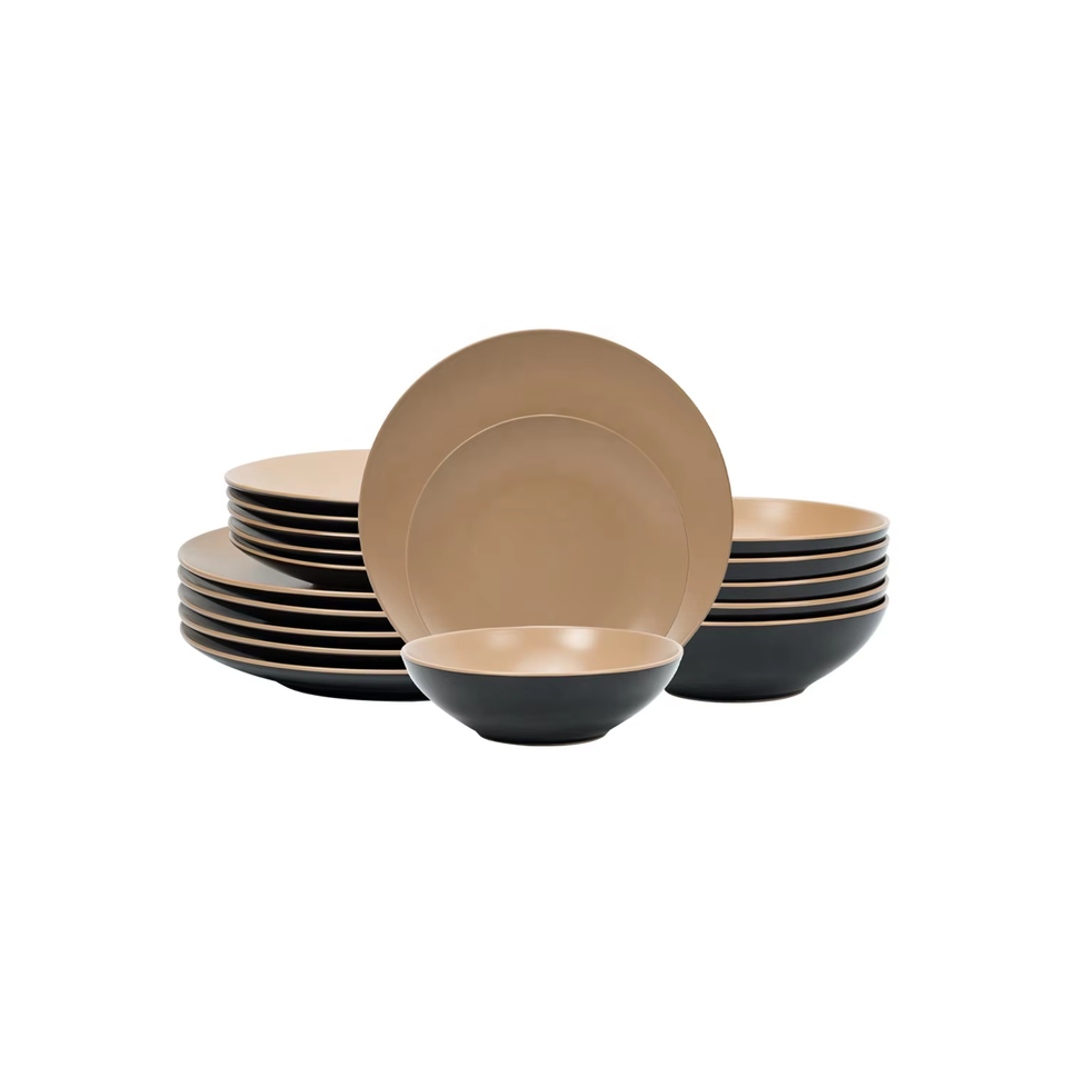 ชุดอาหารเย็น 18 ชิ้น สีเบจเข้ม ดีไซน์เรียบหรู จานเซรามิกสโตนแวร์ พร้อมแก้วกาแฟ ชุดอาหารค่ำใช้งานได้จริง