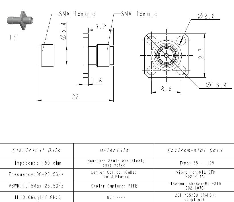 อะแดปเตอร์ RF ตัวเมีย18กรัมพร้อมหน้าแปลนสเตนเลสสตีล kfk kkf Asmfsmff4ซีลความถี่สูง