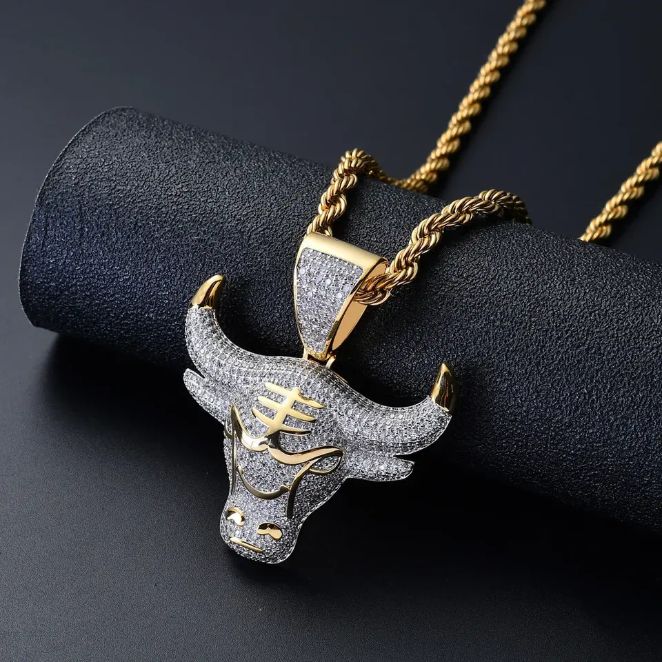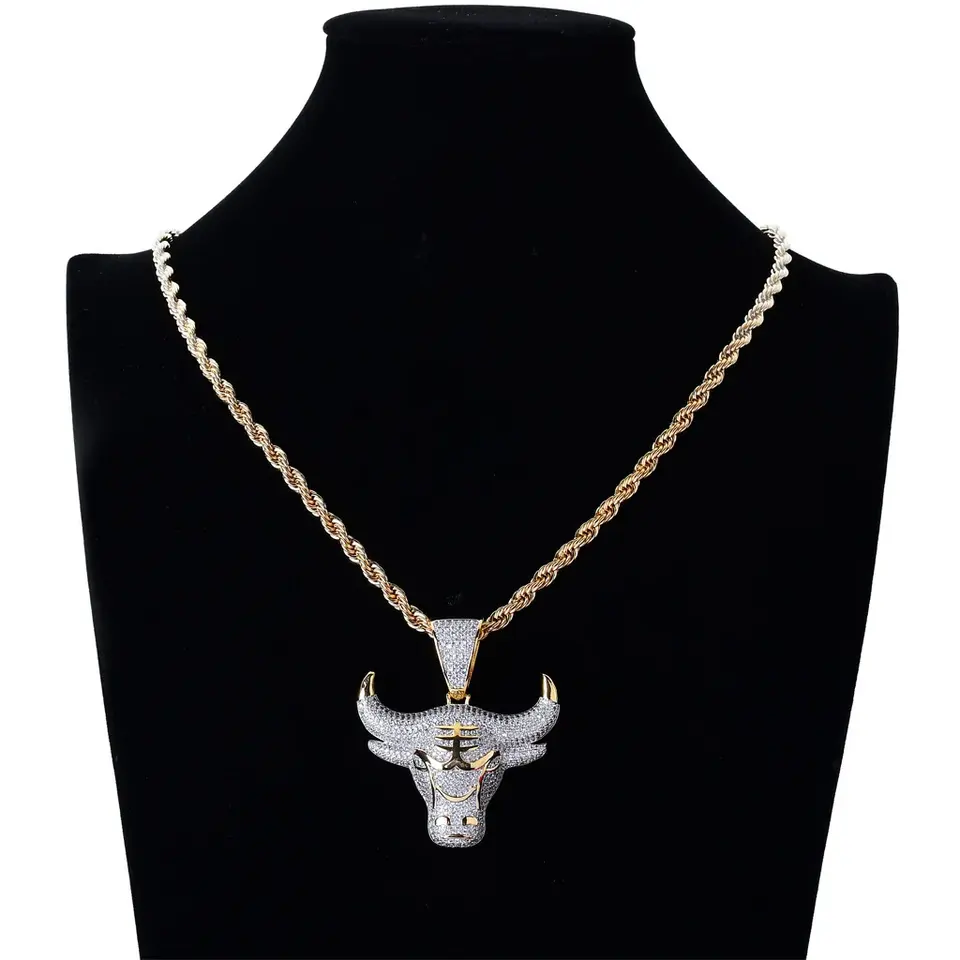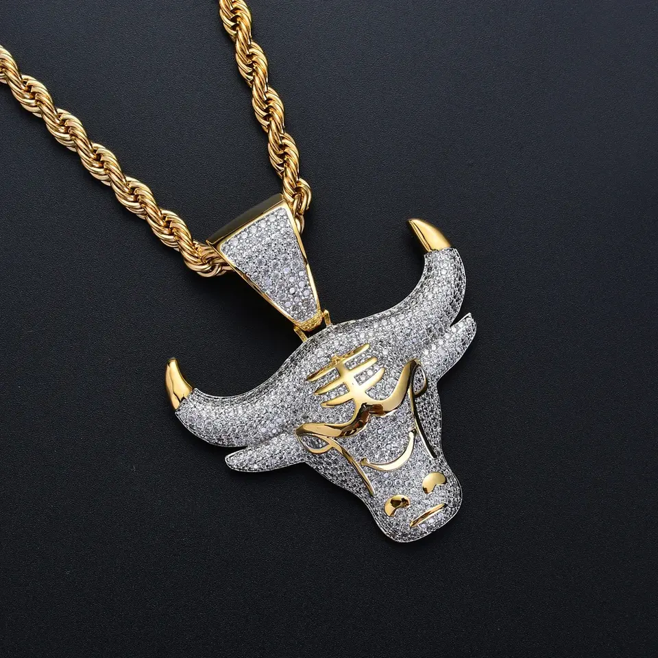 18k Gold Plated Zodiac Cattle Pendant Hiphop Bling Diamond Custom Logo Silver Bull Necklace Mens Animal Charm Micro Pave Link