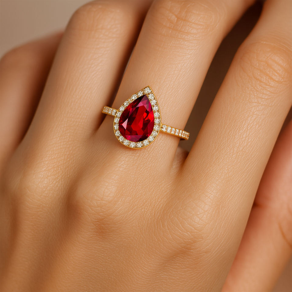 แหวนทองคำแท้ 18k ประดับพลอยทับทิมทรงลูกแพร์เพาะเลี้ยงในห้องปฏิบัติการ แหวนเพชรเม็ดเดี่ยวประจำเดือนกรกฎาคม ประดับเพชรขาวทรงกลมแบบคลาสสิก แหวนแต่งงาน