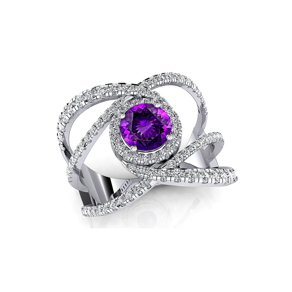 แหวนแต่งงานประดับงานแต่งสีทอง18K แหวนค็อกเทลประดับพลอยอเมทิสต์เพชรแท้โรเดียมชุบแบบง่าม