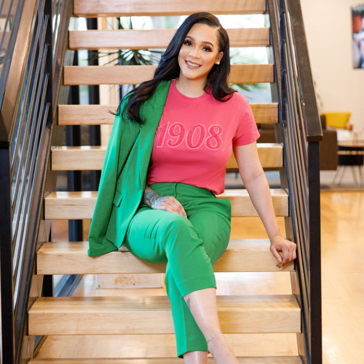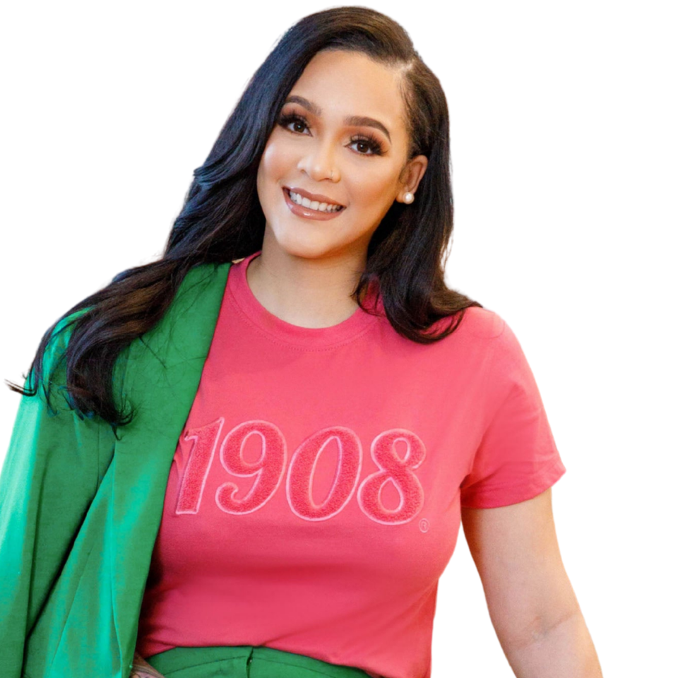 1908 เสื้อยืดสีชมพูเชนิลล์ปักตัวอักษรกรีกเสื้อยืดผ้าฝ้ายพรีเมี่ยมเสื้อผ้าลำลองสำหรับชมรม