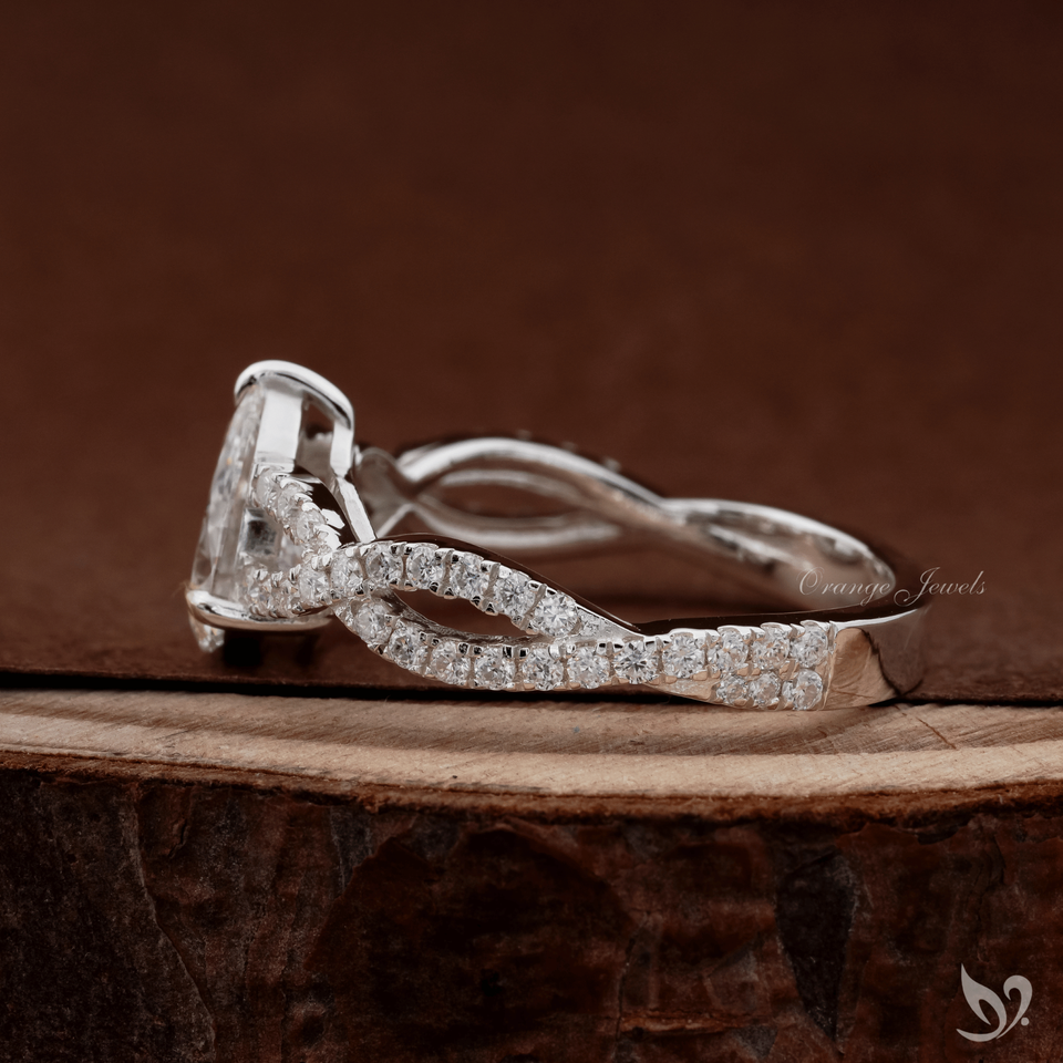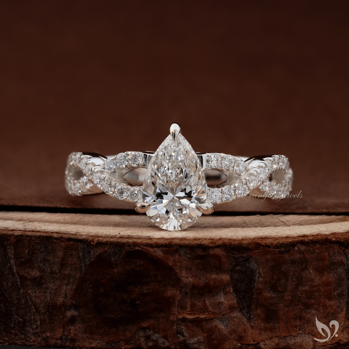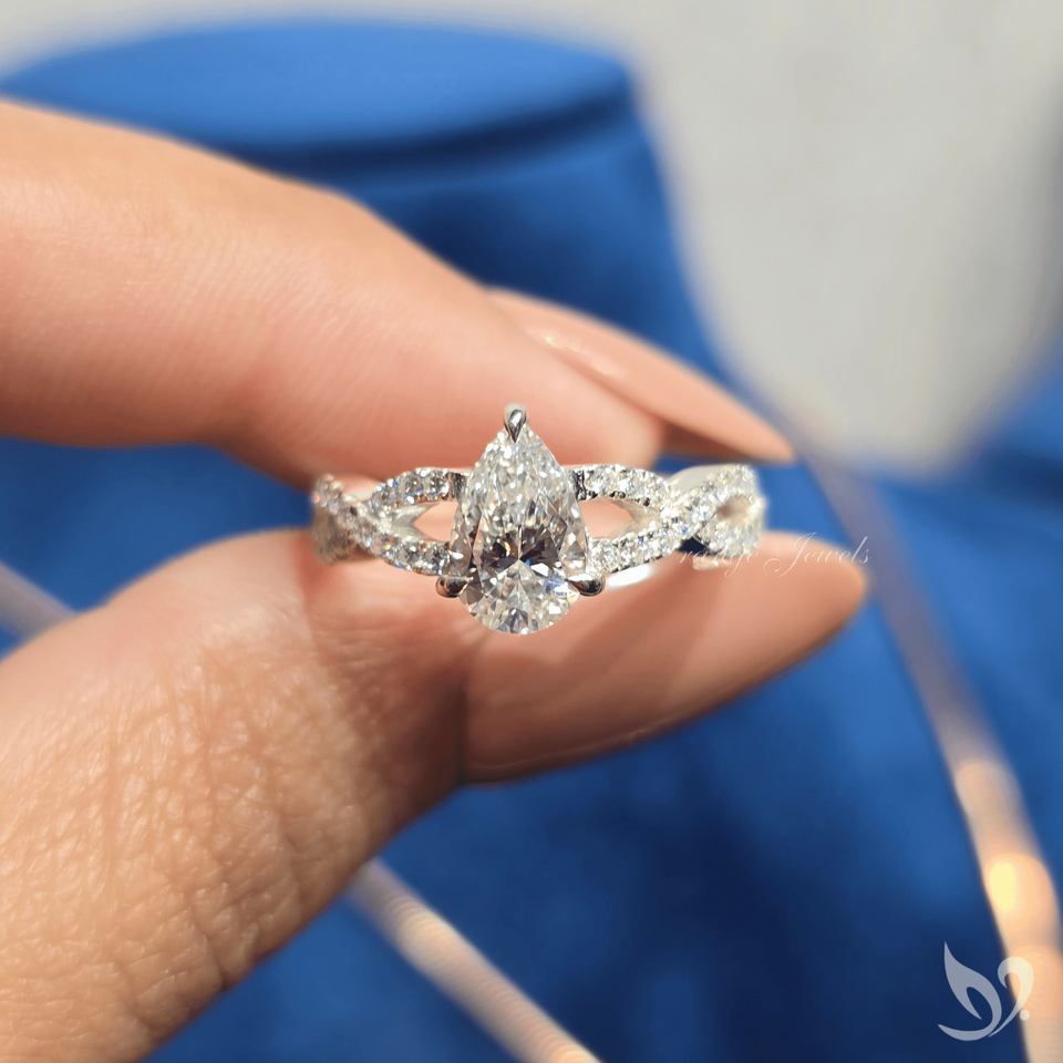แหวนหมั้นเพชรทรงลูกแพร์ 1 กะรัต ได้รับการรับรองจาก IGI เพชรเพาะเลี้ยง ตัวเรือนทองคำขาว 10K ดีไซน์วงแหวนแบบสปลิตพาเวททวิสต์แบนด์ สำหรับผู้หญิง