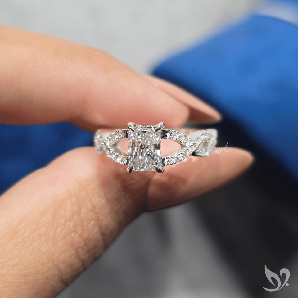 แหวนหมั้นหรูหราทรงเรเดียนท์คัท 1 กะรัต เพชรเพาะเลี้ยง รับรองโดย IGI ดีไซน์วงแหวนไขว้ประดับเพชร ทองคำขาว 10K สำหรับเป็นของขวัญวันครบรอบแต่งงาน