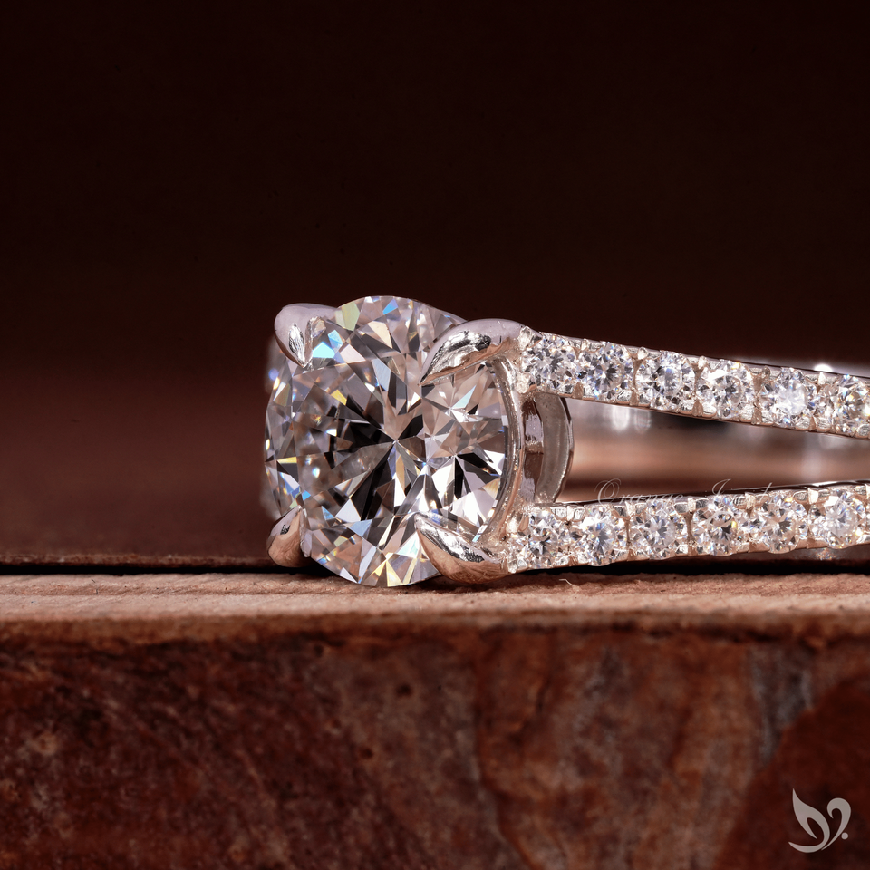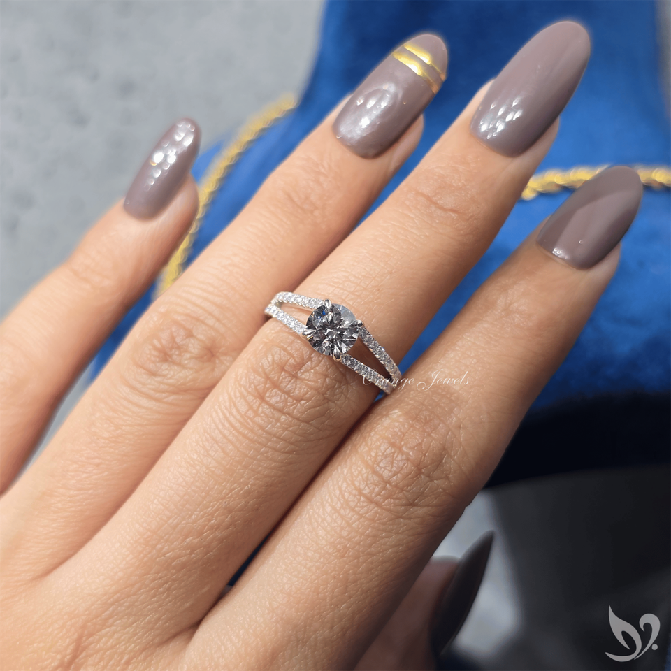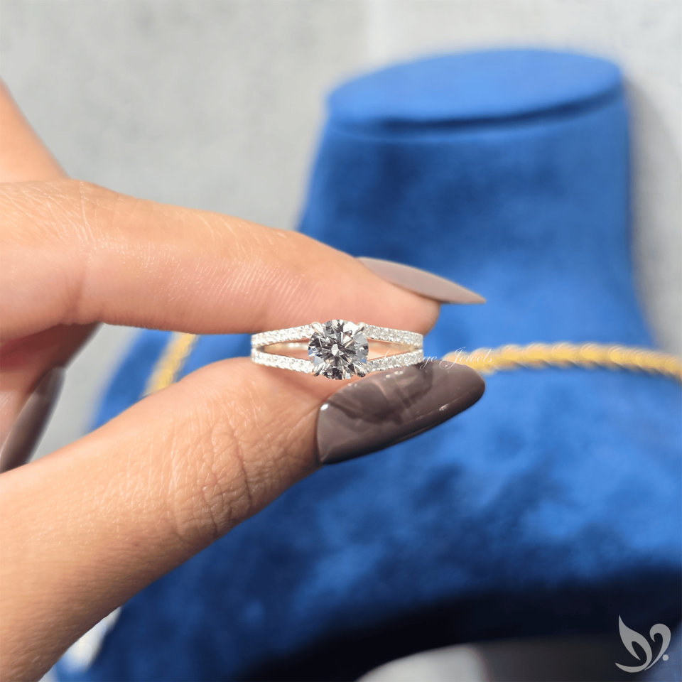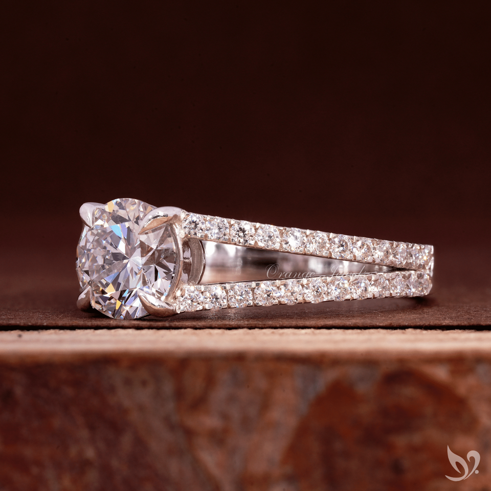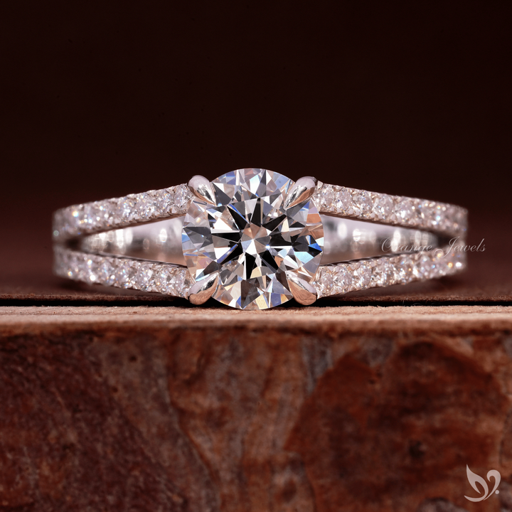 แหวนหมั้นเพชรทรงกลม 1 กะรัต เพชรเพาะเลี้ยงในห้องปฏิบัติการ ประดับเพชรแบบสปลิตพาเว่ ทองคำขาว พร้อมเพชรเม็ดกลางทรงบริลเลียนท์ที่ได้รับการรับรองจาก IGI สำหรับเจ้าสาว