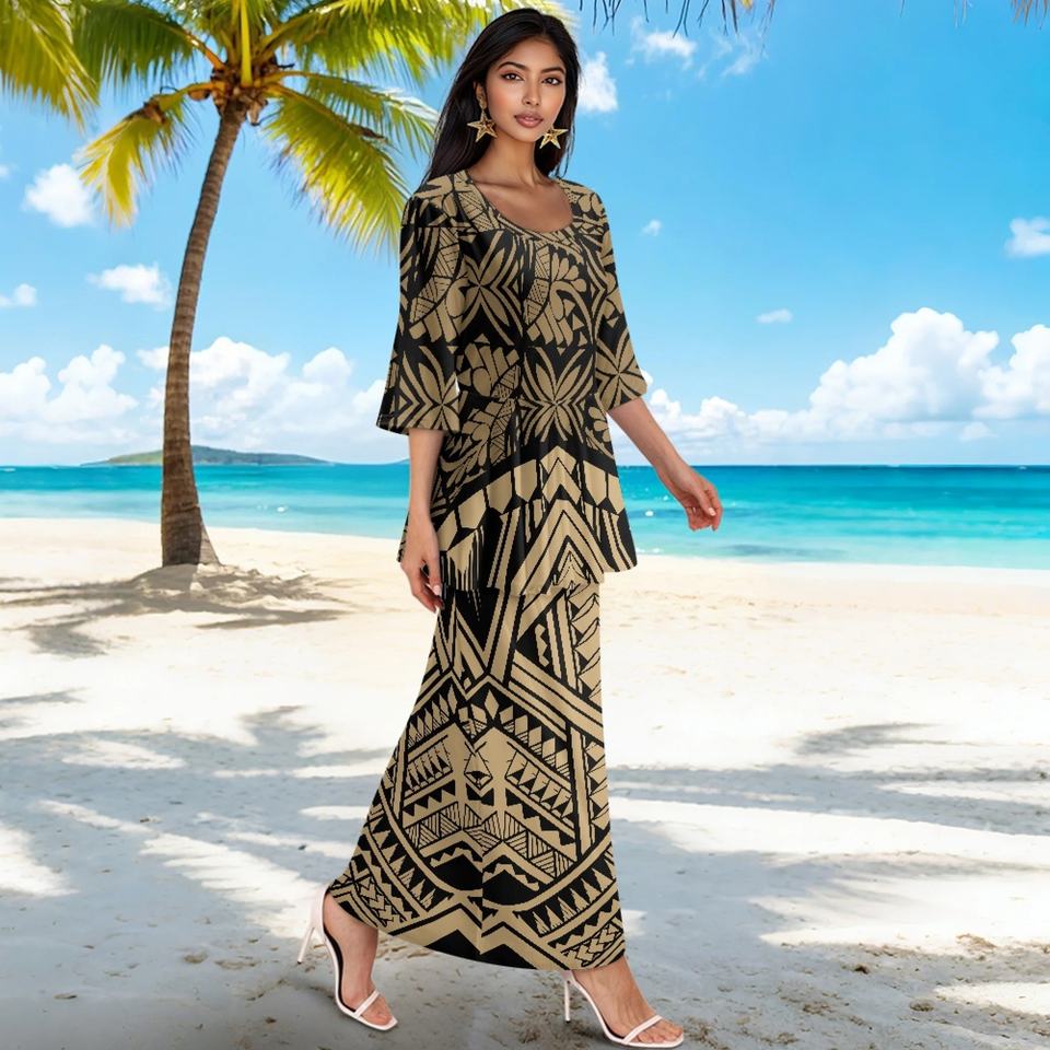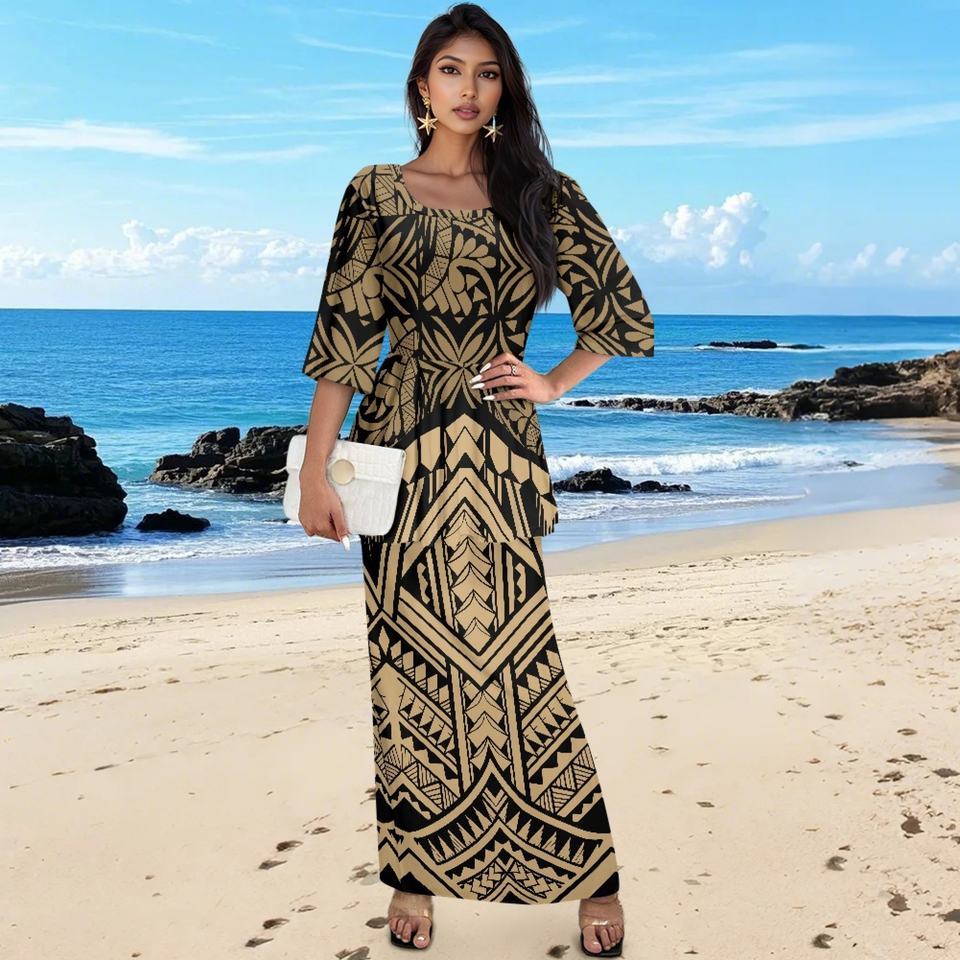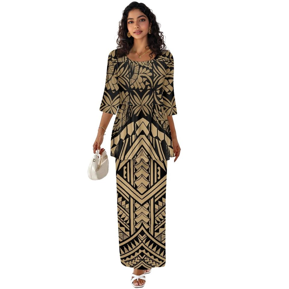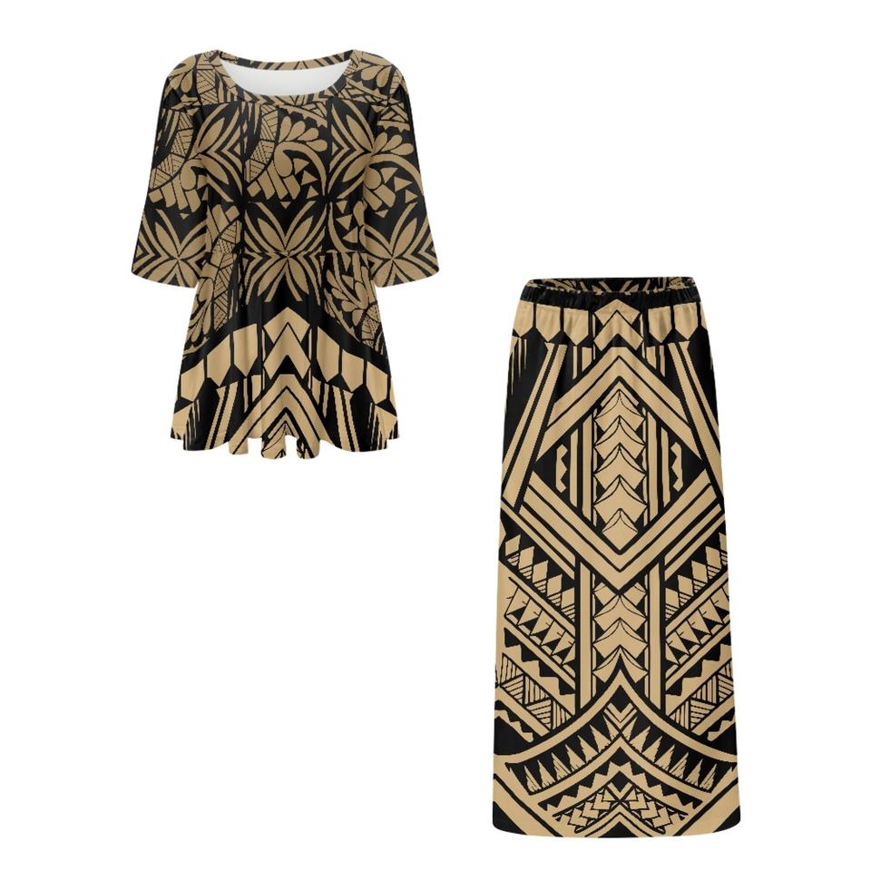 ชุดเดรสสองชิ้นสำหรับผู้หญิงชุดเดรสฮาวายขนาดใหญ่พิเศษออกแบบได้ตามต้องการของ1MOQ 2ชิ้นเสื้อเบลาส์แขนสั้นสำหรับผู้หญิง