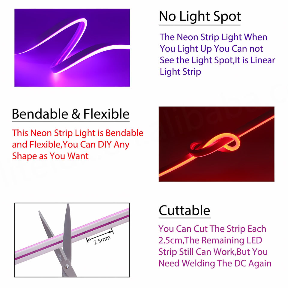 ไฟนีออนซิลิโคนแบบตัดได้ 1 ซม. ยาว 50 เมตร ใช้ไฟ DC12V DC24V ขนาด 5 มม. 6 มม. 8 มม. ไฟนีออน LED แบบมองด้านข้างและด้านบน กันน้ำ IP67 ไฟนีออน LED แบบยืดหยุ่น